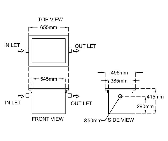 2” inch or 50mm diameter inlet and outlet pipe with coupling end is provided.