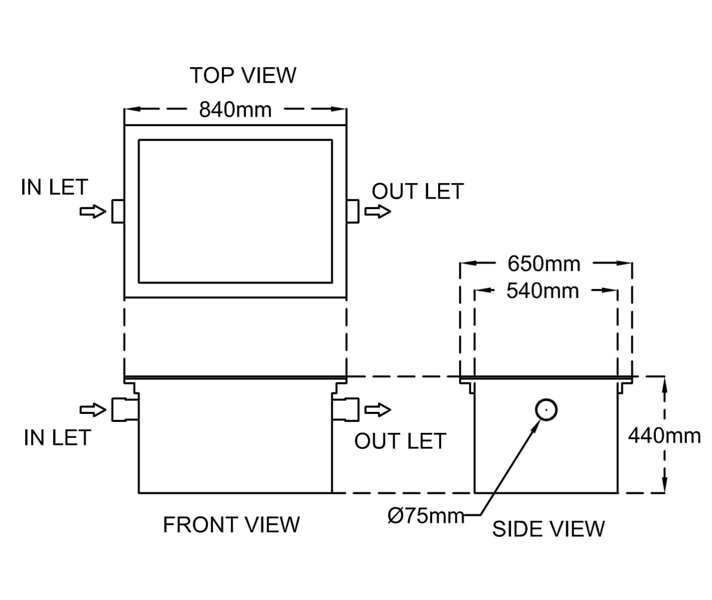 With grease interceptor capacity 35 Gallons per Minute (GPM) or 2.2 Liters per Second (LPS) or 132 Liters per Minute