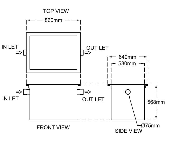 2 ½” inch or 75mm diameter inlet and outlet pipe with coupling end is provided.