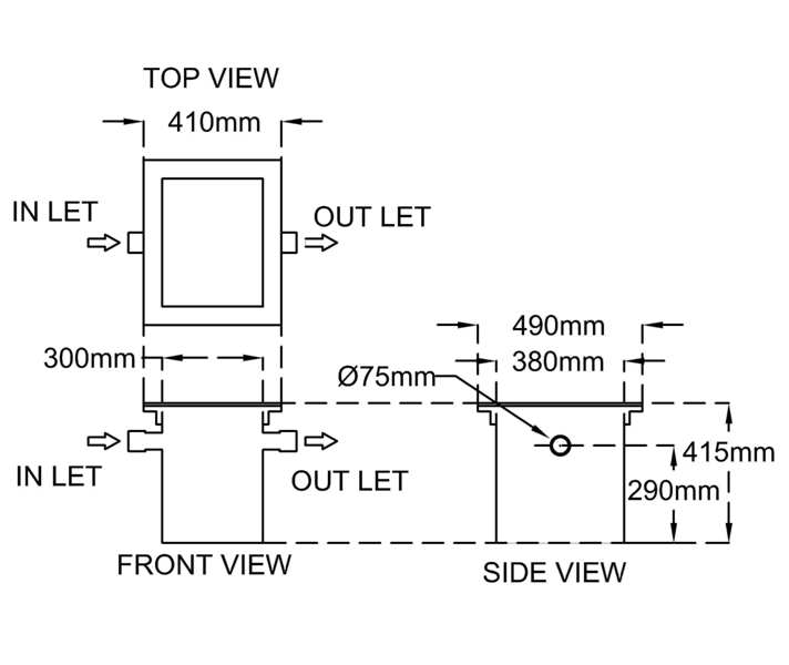 2” inch or 75mm diameter inlet and outlet pipe with coupling end is provided.